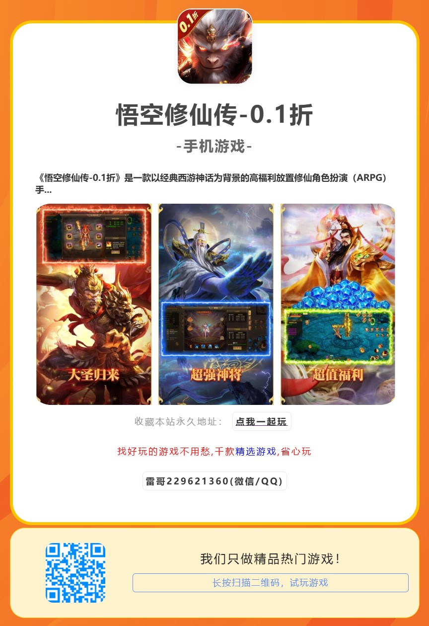 《悟空修仙传-0.1折》是一款以经典西游神话为背景的高福利放置修仙角色扮演(ARPG)手游。游戏还原宏大瑰丽的仙魔世界,玩家将化身天命之子,追随齐天大圣孙悟空的脚步,踏上一段逆天改命、斩妖除魔的热血修仙征途。